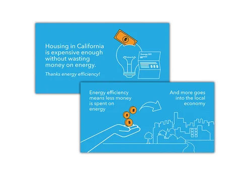 Description: Energy efficiency has a lot of potential to save homeowners money. Working with CA Delivers and Cater Communications, I developed an animated graphic for the Save CA Energy campaign, highlighting the money-saving benefits of energy efficiency.